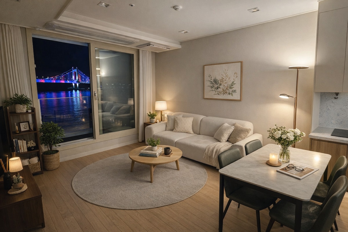 ❤️Recientemente, la habitación se amplió Tiene 2 dormitorios y 1 sala de estar. Puedes dormir cómodamente con 1 cama queen y 2 camas dobles :) Gracias por visitar la villa Anri. Fantástica vista al puente con el puente Gwangan muy 🎇cerca (vista completa al mar) Puedes verlo tanto desde la💕 sala de estar como desde el dormitorio. Sanación con vistas completas al mar y al puente de Gwangan “Comparte tu vida”💖 Alojamiento de clase prémium de 20 pyeong de nueva construcción👍 Priorizamos el lavado, la desinfección, la limpieza y la limpieza de la ropa de cama todos los días.😉🎇 Estacionamiento gratuito en el primer y tercer piso del edificio del🍃 alojamiento (autopropulsado) Disfruta de 🍃Netflix YouTube y mucho más con un televisor inteligente. Milak The Market 🍃justo al lado, a 10 minutos en auto de Haeundae. Hay servicios como una cafetería y una tienda de vinos en el 🍃primer piso. Té 🍃🍃 antiestrés (orgánico), café por goteo a mano e incienso están disponibles. Si tu mente es complicada, espero que se sienta un poco aliviada con té caliente y aromas.