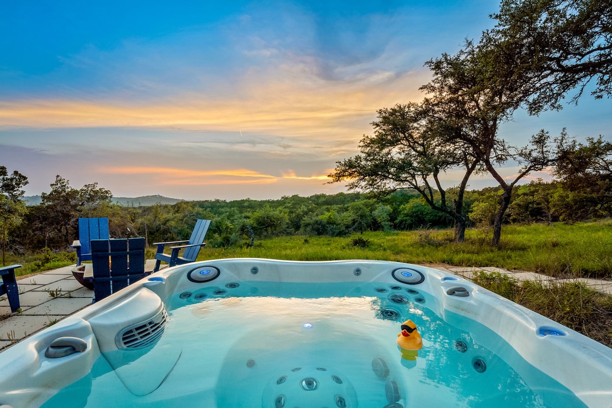 ¡La luz natural abunda en esta moderna casa de campo en las colinas! Explora 30 acres de impresionantes robles y flores silvestres de temporada. Sumérgete en tu jacuzzi privado en la cresta o date un chapuzón fresco en la piscina. El sofá al aire libre está posicionado para la observación de aves y la lectura de libros. Asa a la parrilla al aire libre, cocina adentro o aventúrate a una de las bodegas, destilerías o restaurantes cercanos. Pero cuando el sol baje, prepárate para las puestas de sol inigualables y los cielos más estrellados de Texas. ¡Bienvenidos a la felicidad!