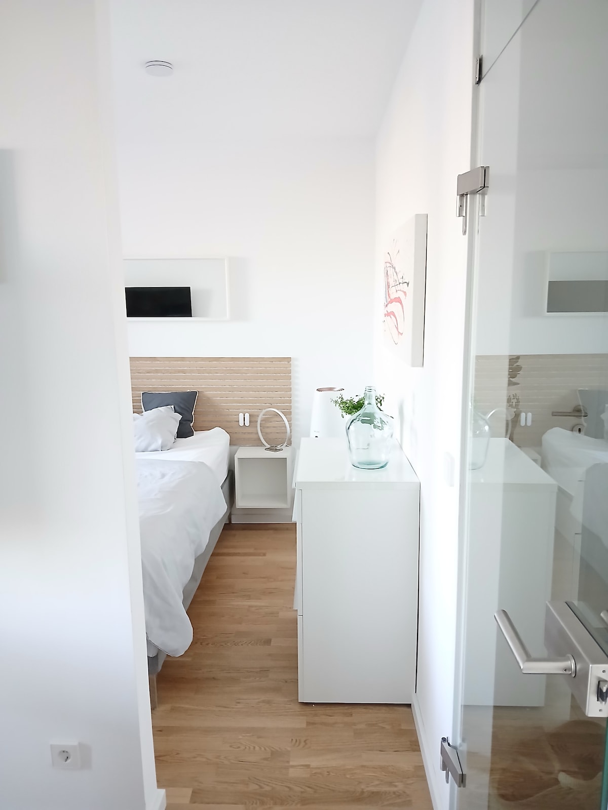 El luminoso departamento está recientemente renovado y amueblado. La sala de estar y el dormitorio tienen una gran cama tamaño king (160 cm), un televisor inteligente 4k 4k listo para cine en casa de 55pulgadas con Netflix y acceso a Amazon Prime, una mesa de trabajo, un armario y un acogedor sillón. También hay una cocina con instalaciones completas y un baño completamente recientemente renovado con ducha. Hay una lavadora de monedas en el edificio.