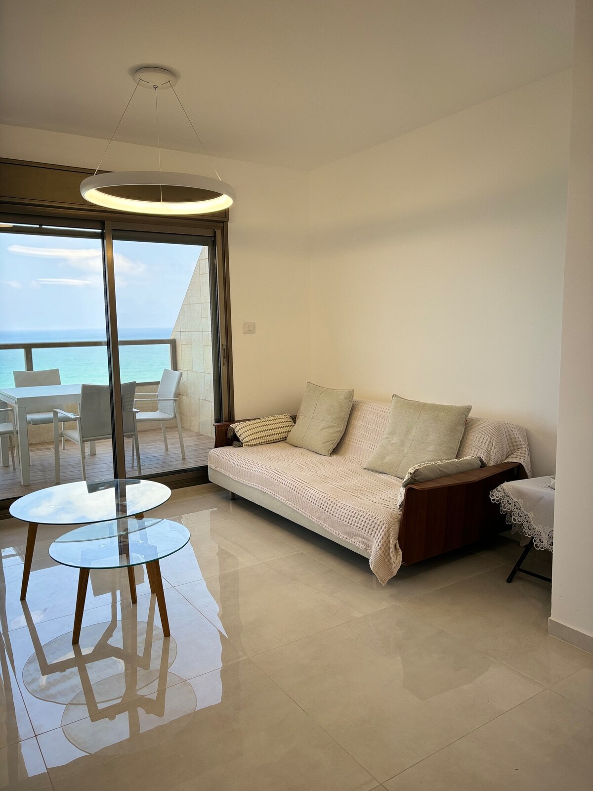 Bienvenido a un estudio renovado frente al mar sobre la playa, donde te esperan impresionantes vistas al mar, puestas de sol y el sonido de las olas. Este estudio ofrece un diseño moderno de primera categoría, a 15 minutos a pie del Kikar y la entrada pública de la playa, en el edificio: supermercado, estacionamiento gratuito, bufet/restaurantes, ascensor de Shabat. Una opción acogedora perfecta para parejas. Las fotos son auténticas.
