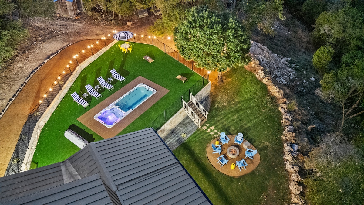 🏠 Designer home in the Texas Hill Country, offering vaulted ceilings, walls of windows, and natural light to create a stunning private retreat. Relax in the 8-ft hot tub, swim in the 35-ft private pool, or indulge in movie nights in the private theater. Minutes from top wedding venues, wineries, breweries, BBQ joints, and nestled behind a serene nature preserve. ★ "An unforgettable escape—perfect for families, corporate groups, or wedding guests seeking comfort and style in the Hill Country!"