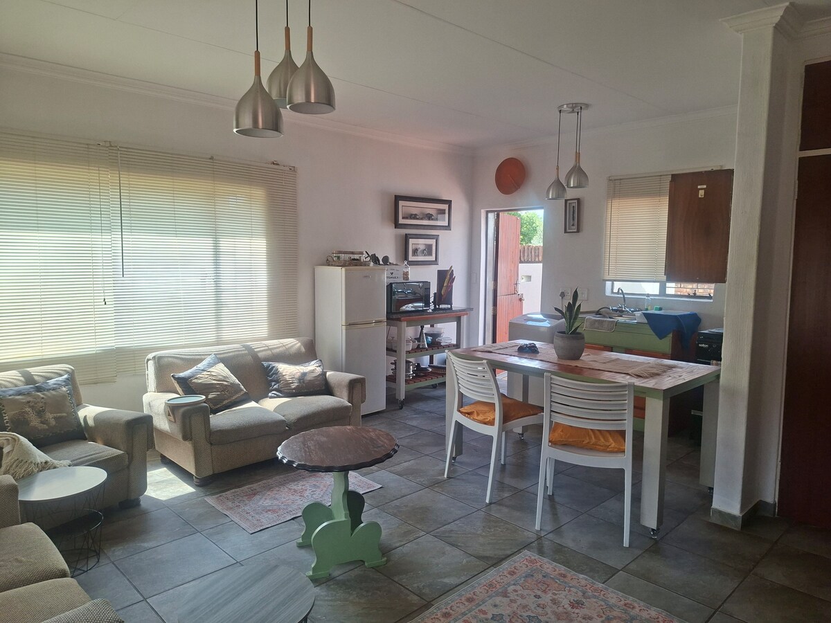 Te damos la bienvenida a tu hogar lejos de casa. Salga a un patio privado. Es el lugar ideal para encender el braai y relajarte con una bebida refrescante. Nuestra casa de campo está separada de la casa principal con su propia entrada y aparcamiento con cerradura. Nuestro alojamiento presenta una decoración de buen gusto de inspiración bohemia, que crea un ambiente vibrante y relajado. Te enamorarás de los acabados de madera en todo el espacio y de su belleza natural para la estética general. Esta joya no tiene restricción de carga.