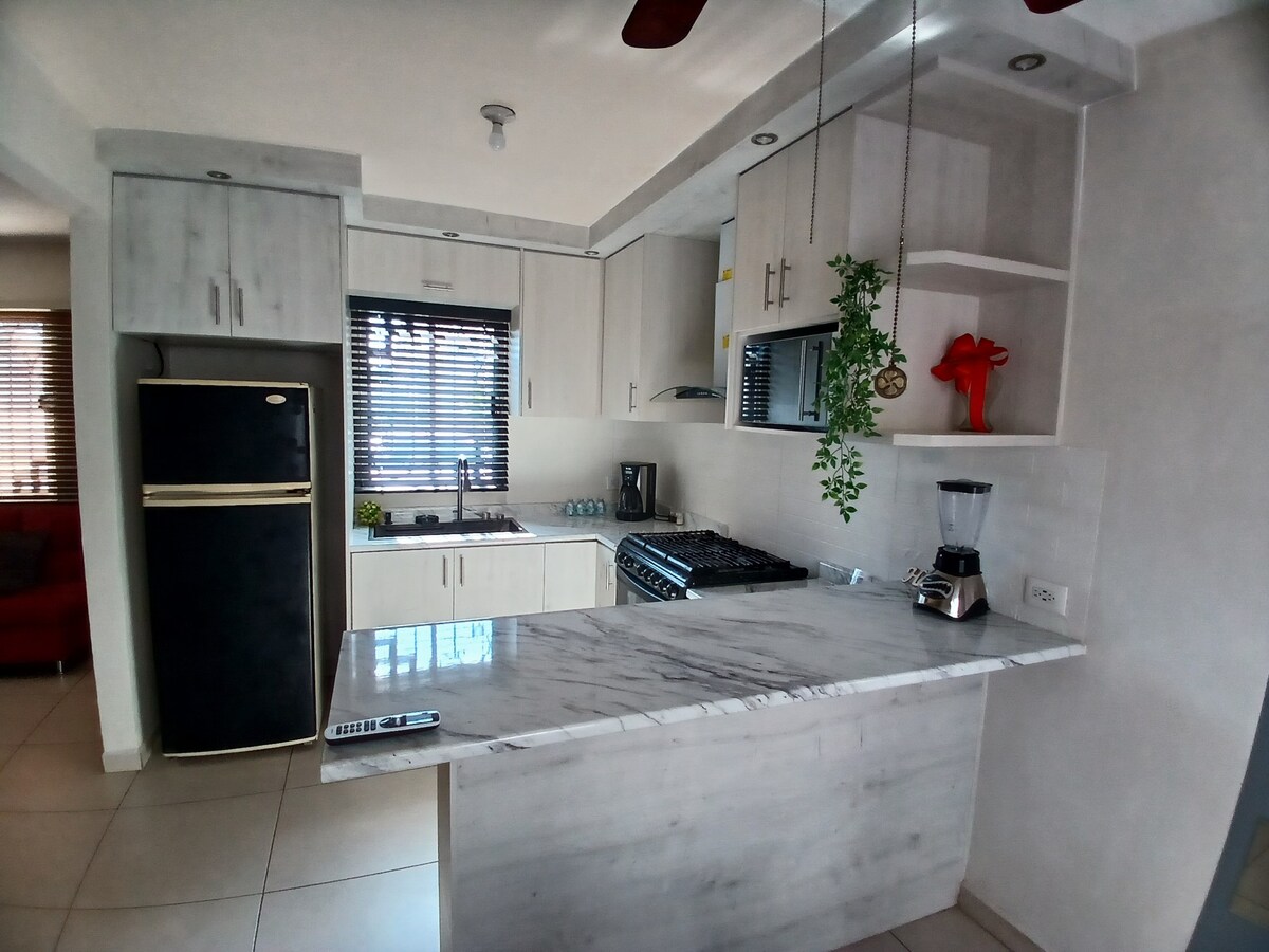 Departamento nuevo ubicado en planta alta, cuenta con todo lo necesario para pasar un agradable momento. La propiedad cuenta con cámaras de seguridad las 24 horas, tiene dos accesos, una puerta eléctrica para vehículos que da al área de estacionamiento y una puerta peatonal. En caso de estadías largas contamos con descuento por semana y por mes.