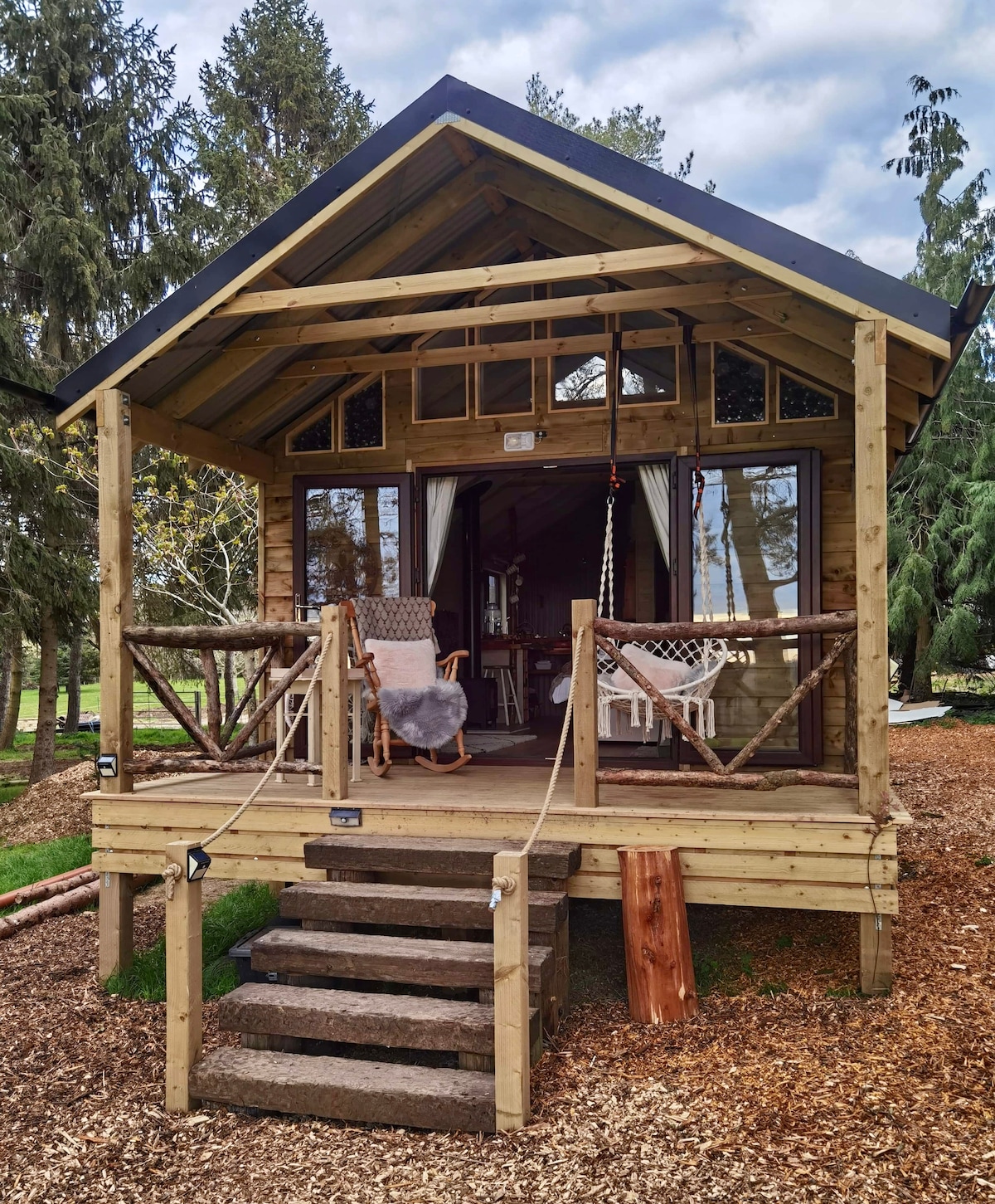 Pinetree Lodge es una escapada romántica y de lujo en Cotswold, enclavada en su propio bosque pequeño y cerrado en nuestra granja activa de ovejas y cultivos. Un lugar tranquilo donde puedes relajarte y recargar energías. La gran sala de estar exterior proporciona una barbacoa/fogata con accesorios a petición para asar o hacer comidas de una olla y una barbacoa de gas también. Un quemador de leña eficiente proporciona un amplio calor en las noches más frías y durante los meses de invierno. La cocina es básica, una pequeña estufa de gas da para una buena taza y un desayuno frito en el interior.