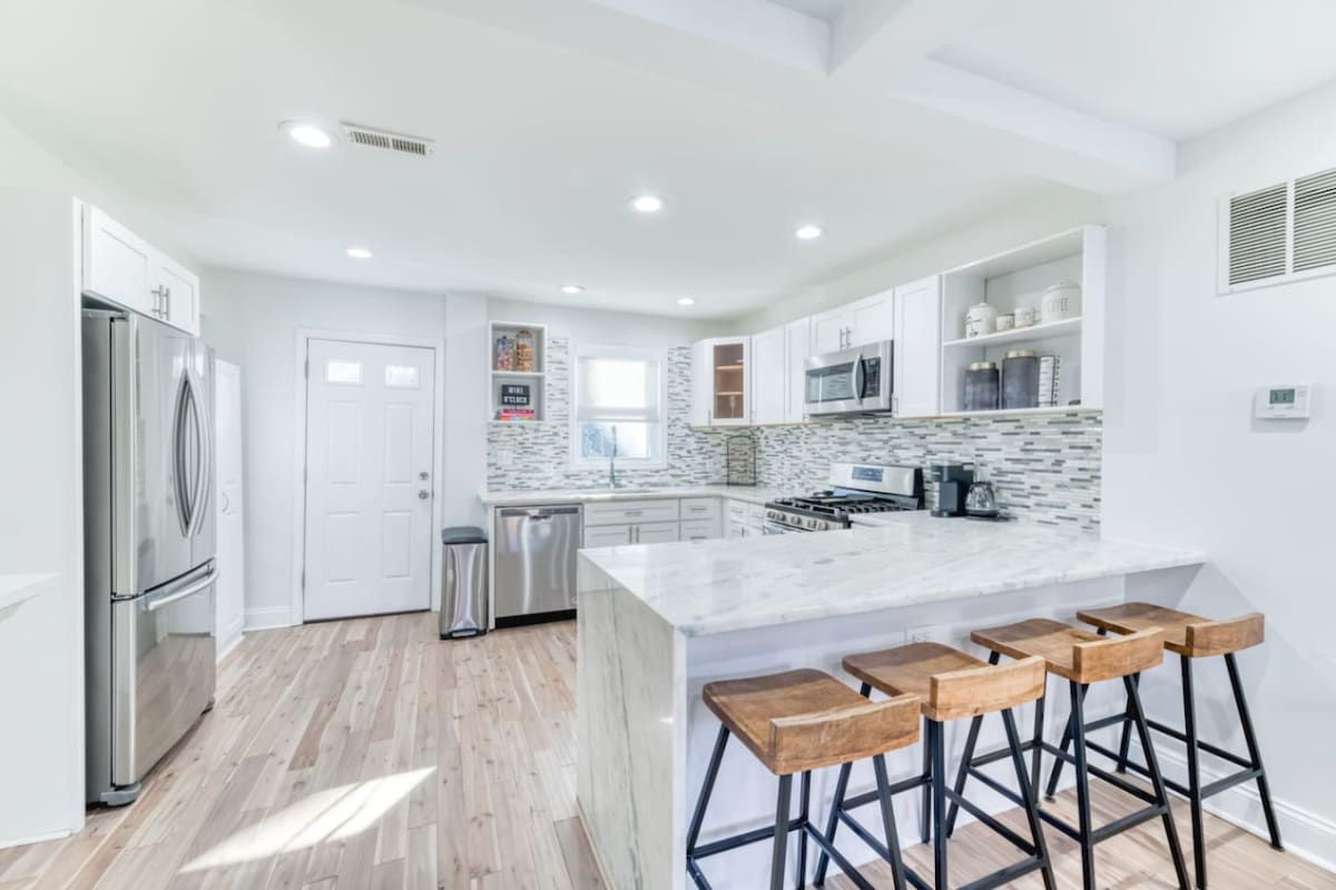 UN HALLAZGO EXCEPCIONAL: ¡Habitación y baño en el nivel principal sin escalones! ¡Te damos la bienvenida a tu elegante refugio en D.C.! Esta casa de 5 dormitorios y 4 baños totalmente renovada ofrece 325 metros cuadrados de vida de concepto abierto, a solo 3 minutos del metro y a 10 minutos de la Casa Blanca. Disfruta del estacionamiento gratuito en la calle. Perfecto para familias o viajeros de negocios con un dormitorio en la planta principal, cocina de chef, salas de estar dobles, Wi-Fi rápido y televisores inteligentes. Reserva tu estadía hoy y experimenta D.C. con comodidad y estilo.