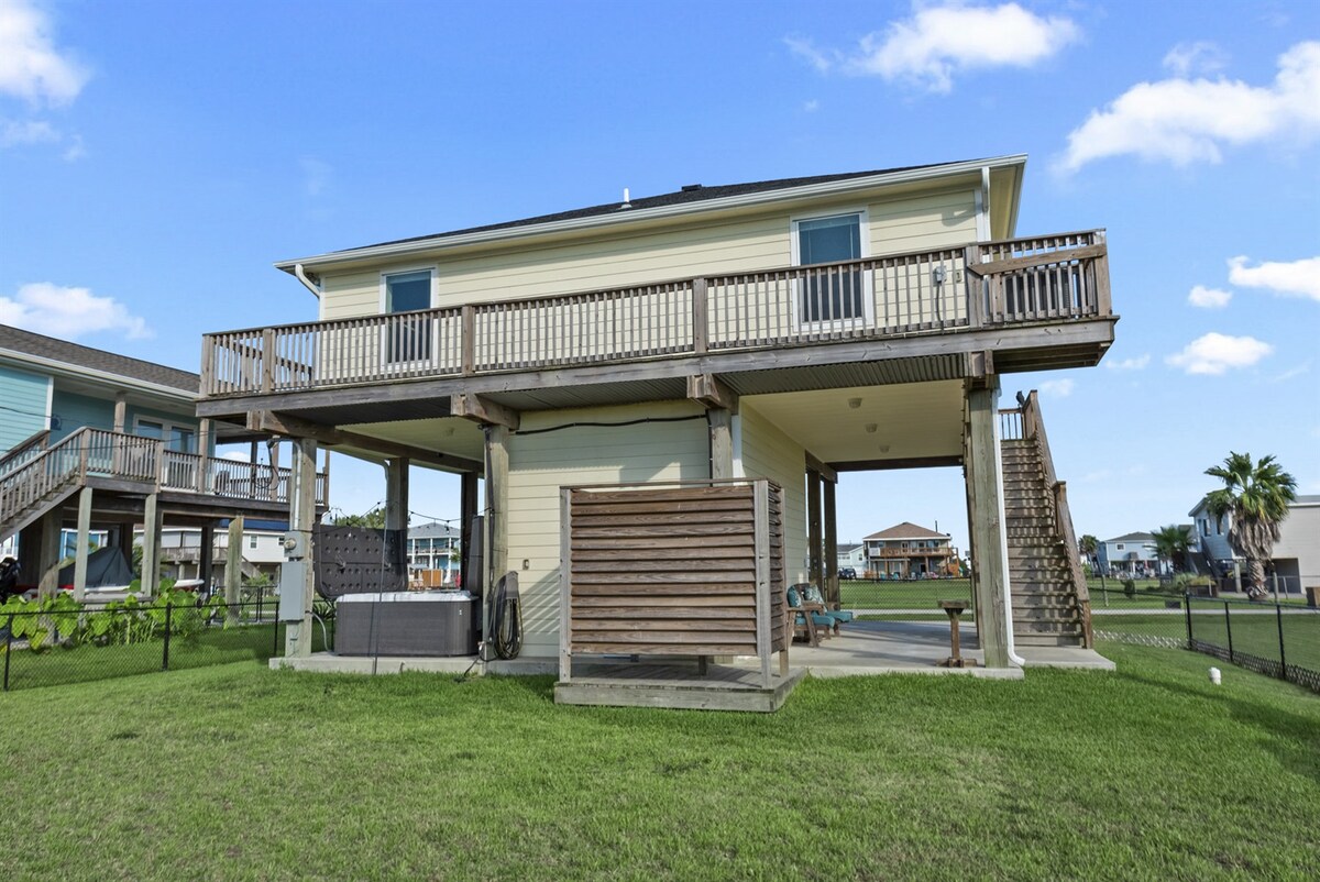 Acogedora casa de 3 dormitorios y 2 baños, con una ocupación máxima de 7 personas. ¡La casa está recién remodelada y tiene todo lo necesario para pasar unas vacaciones familiares perfectas! Pasa el día explorando las atracciones cercanas, pescando desde el patio delantero o simplemente disfrutando de las hermosas vistas desde tu terraza privada arriba y abajo. La casa se encuentra a 13 minutos de The Strand en Galveston, a 24 minutos del dique de la ciudad de Texas y a 30 minutos de Kemah. Solo se puede acceder a la casa por escaleras, no se admiten mascotas.