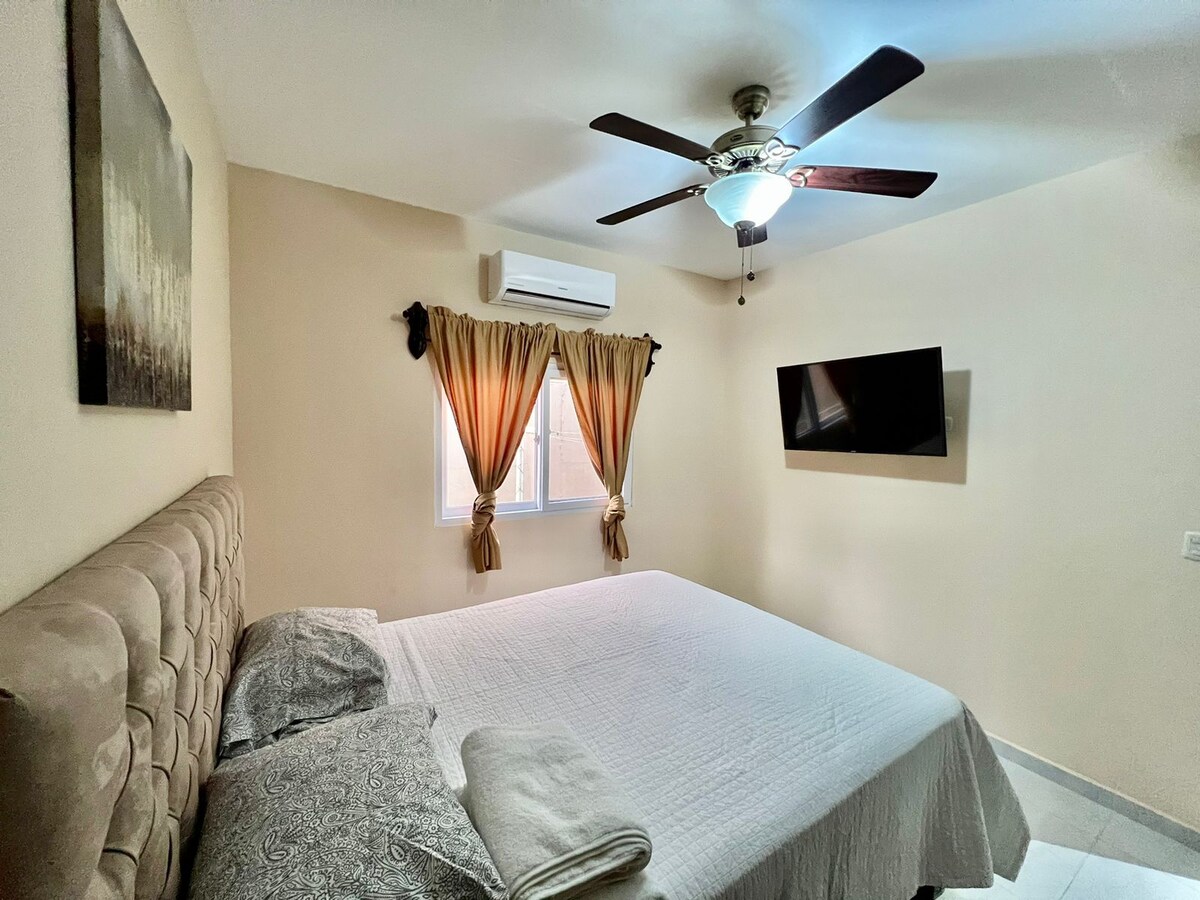 Relájate en esta Preciosa Suite única y tranquila. Ven a divertirte en un lugar seguro, cerca de las Playas y Piscinas con todas las comodidades: Internet de alta velocidad, Smart TV de 50¨ con acceso directo a Netflix, Youtube, etc., Cocina completa, Secadora p/Ropa, A/A, Agua Caliente y todos los accesorios para la cocina. Es el lugar mas próximo para trasladarse a Cayos Cochinos y también ideal para ejecutivos que necesitan un lugar propicio para trabajar. Ubicado en Hotel & Villas Palma Real