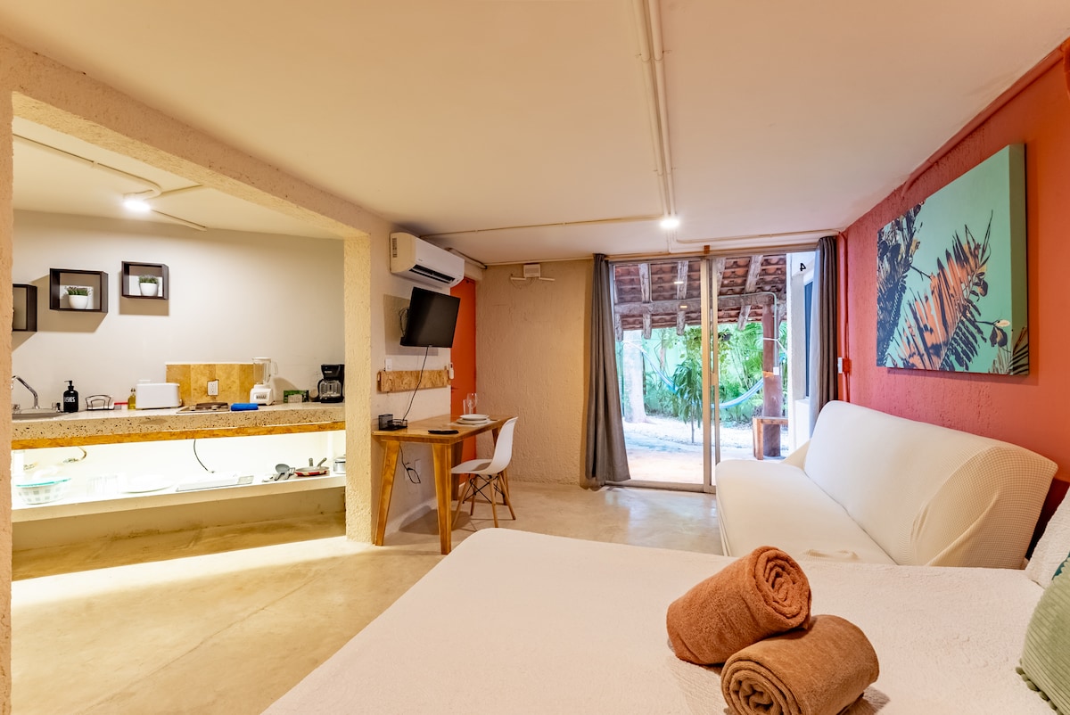 Hermoso alojamiento con entrada independiente y jardín privado que conduce a una cómoda suite con cama queen para dos personas, baño completo y cocina privada. La alberca es el único espacio compartido. Se encuentra en una zona mixta con restaurantes y variedad de tiendas. A 300 metros está la entrada a la Zona Hotelera, donde pasa transporte público hacia la playa, y a 5 minutos la estación ADO, con rutas al aeropuerto y otros destinos turísticos.