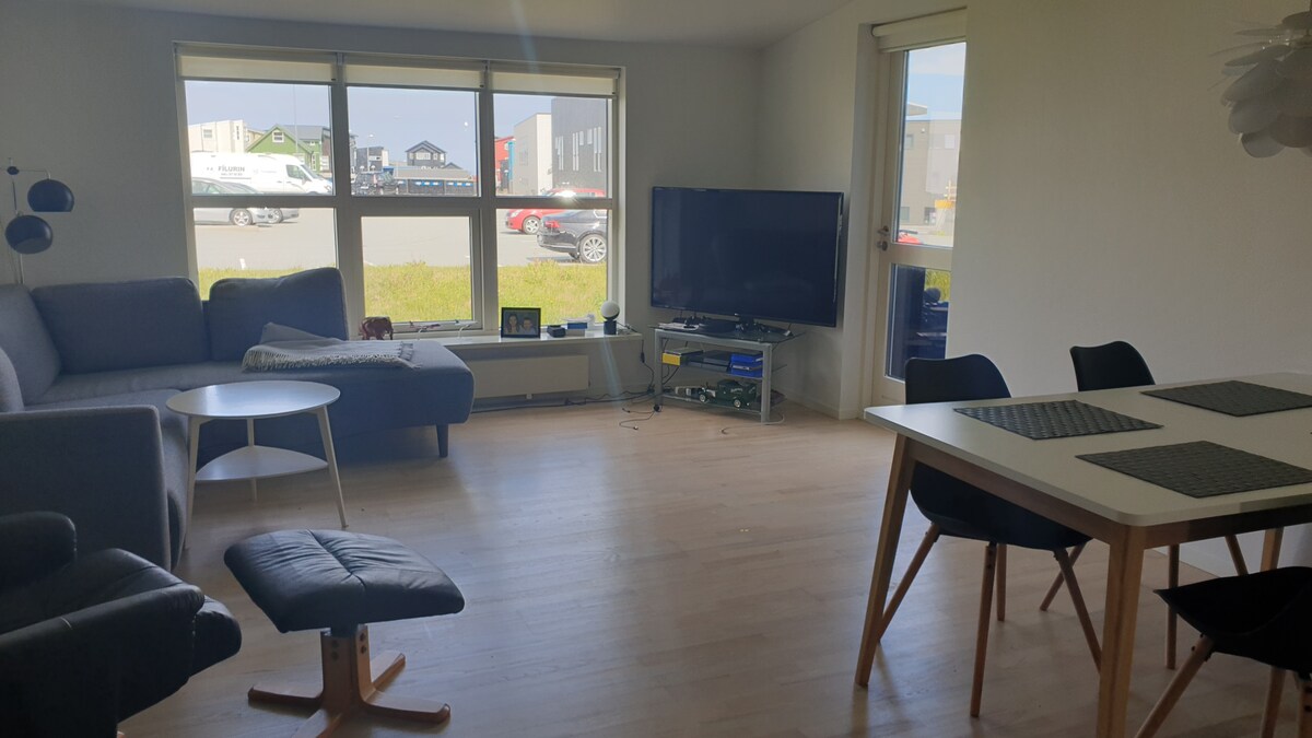 Nuevo apartamento renovado con colores brillantes situado cerca de zonas pintorescas. A solo 1 minuto del servicio gratuito de autobús a todo Tórshavn. El apartamento tiene su propia entrada y tiene 56 m2 con un dormitorio, un baño y cocina y sala de estar en uno. El dormitorio tiene una cama doble (140 cm) y una cuna de viaje para niños pequeños si lo deseas. La sala de estar tiene un sofá cama donde dos personas pueden dormir. Wifi gratuito y nuevo Smart TV. Estacionamiento gratuito justo afuera.