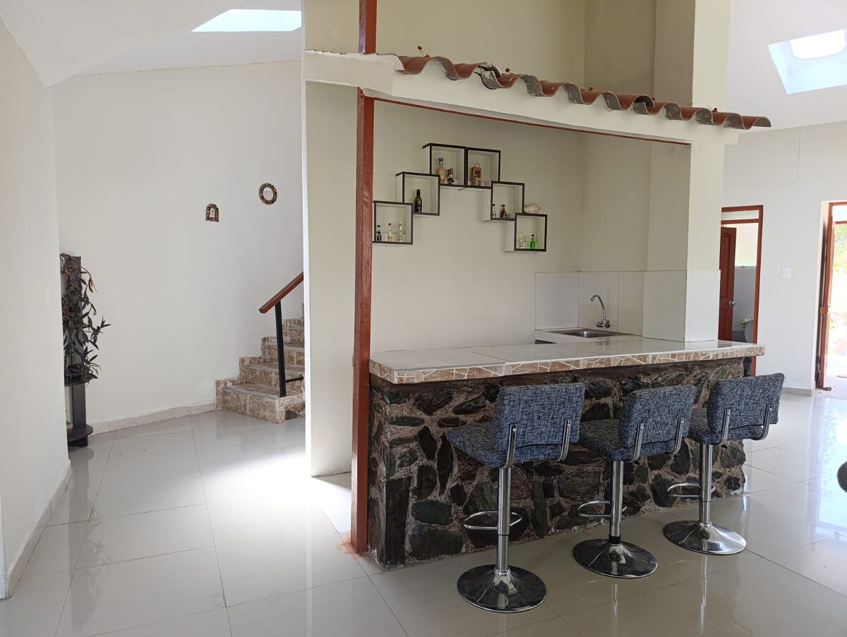 We have all the services and equipment for your comfort, suitable for long stays and virtual work, the surrounding landscape is unique, in the mornings you can see the snow-capped Veronica that surrounds it, the Vilcanota River and beautiful forests, the weather is warm and the nights are starry, we have a barbecue area, parking, the house has a kitchen, living room, dining room, bar, 4 bedrooms, 3 bathrooms, ping pong and children's games, the area is approx one hectare. We also accept pets.