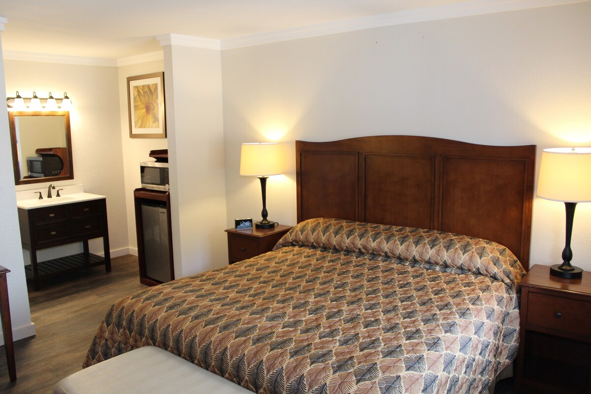 La habitación dos en el histórico Schoolhouse Inn ofrece una hermosa vista a la secuoya y al parque desde el patio, una cama tamaño king con sábanas de felpa, una cafetería completa y un baño recientemente renovado con comodidades refrescantes. Disfruta de tu café de la mañana con los sonidos de los leones marinos que resuenan ante ti, o mantente cómodo con una taza de té caliente y un programa en el televisor inteligente. Ya sea que estés aquí para relajarte o para aventurarte, ¡esta es la habitación ideal para ti! * Solo se permiten 2 huéspedes en esta habitación*