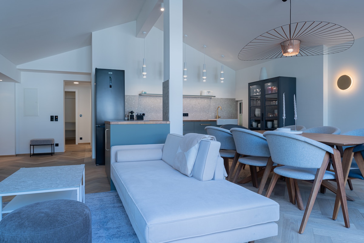 Este espacioso apartamento tiene capacidad para 4 personas. El diseño de interiores corre como un hilo rojo a través de todo el ático, con tonos cálidos en el suelo de espiga de roble, muebles en chapa de nogal y detalles modernos como los azulejos de terrazo. Se ha creado un lugar para sentirse como casa y relajarse. En el corazón de la región de esquí Ski Amadé, sobre el Ort Tischlerei y justo en el centro del pueblo junto al Fritzbach, se encuentra el ríoLoft con vistas al Hochkönig.