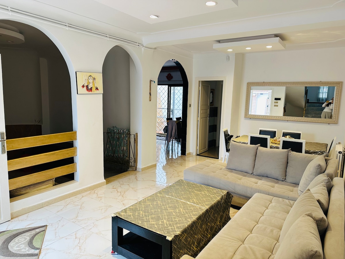 La villa "Tradition d'Alger" est située dans le quartier très prisé d'Hydra. Elegant, tranquille, ce logement de 140m2 vous ravira par son confort. Vaisselle et literie neuve incluse, parking disponible gratuitement. En supplément, un service de ménage est inclus dans le prix (1 jour sur deux). Un petit-dejeuner typiquement algérien vous est offert chaque matin (minimum 2 jours de reservation). Au plaisir de vous recevoir,