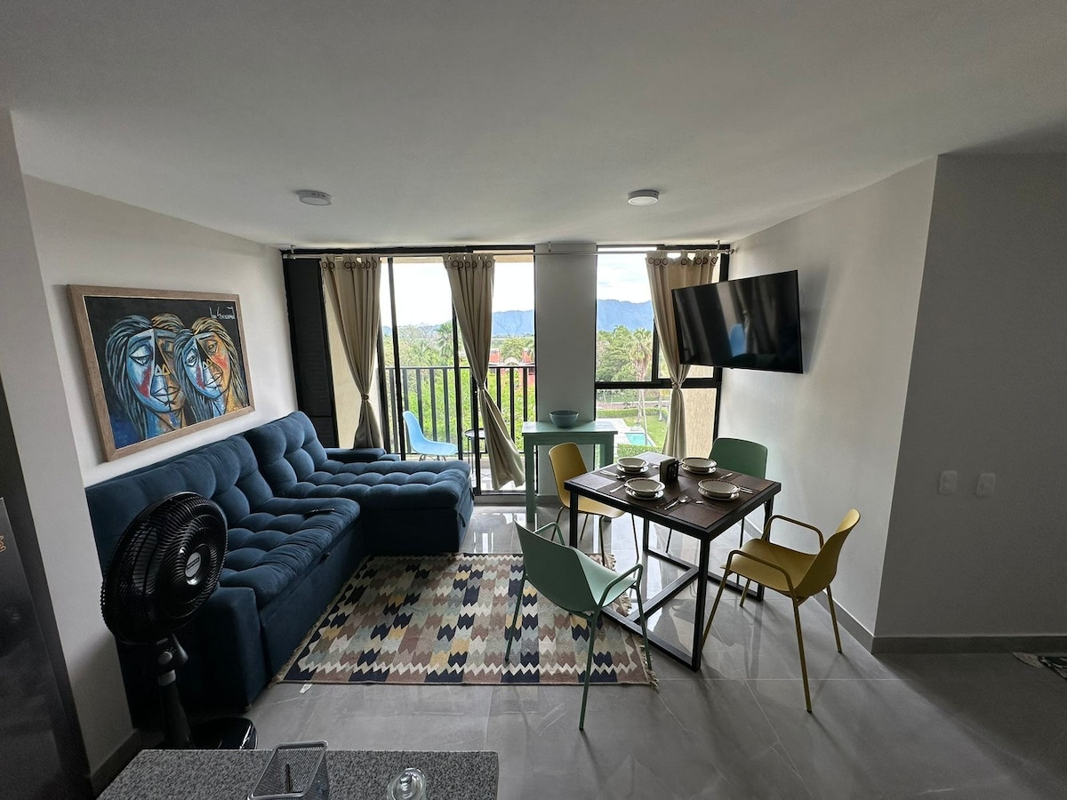 Este alojamiento único tiene mucho espacio para que disfrutes con los tuyos. 3 habitación con clóset Habitación principal con cama doble y baño privado Dos habitaciones auxiliares con cama sencilla Baño social Sofá cama doble Cocina totalmente equipada Lavadora Nevera Smart TV Wifi de 800mbp 2 ventiladores Agua caliente Excelente vista a las montañas Zonas comunes (piscina, bbq, skatepark, cancha sintética) Parqueadero privado cubierto