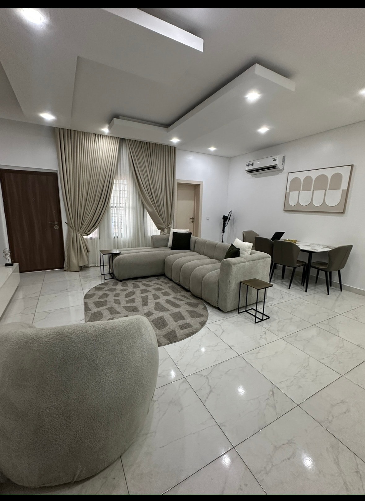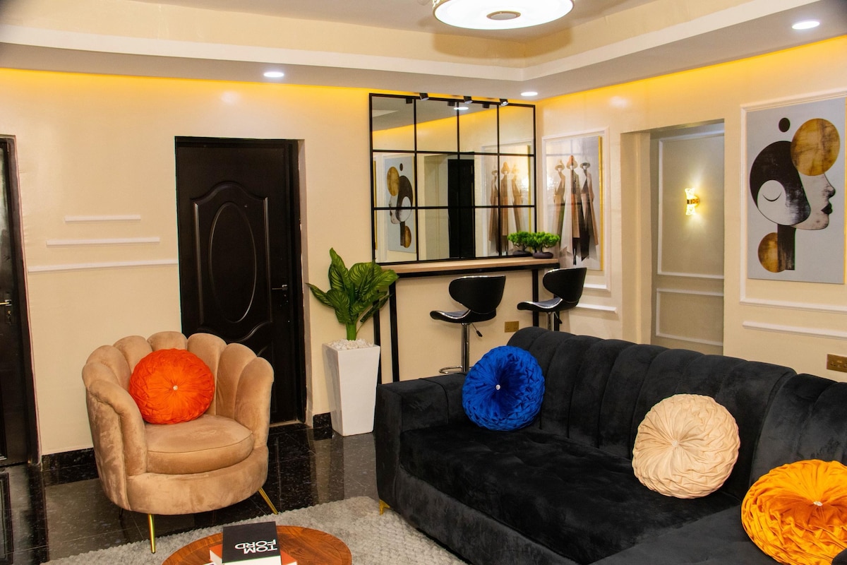 Hemos combinado con éxito esa sensación de hotel de 5 estrellas con una sensación de hogar en este espacio sorprendentemente hermoso. Recién renovado, el dormitorio está demarcado de la sala de estar con perfiles de madera de caoba pura que albergan dos televisores integrados. Obtienes tu propia sala de estar privada, aire acondicionado, refrigerador, televisores inteligentes de 55 pulgadas. Una espaciosa cocina moderna con estufa de 4 quemadores. El baño viene con agua caliente a presión. ¡La electricidad es de 24 horas! La seguridad es 24/7. El wifi es súper rápido e ideal para huéspedes que trabajan.