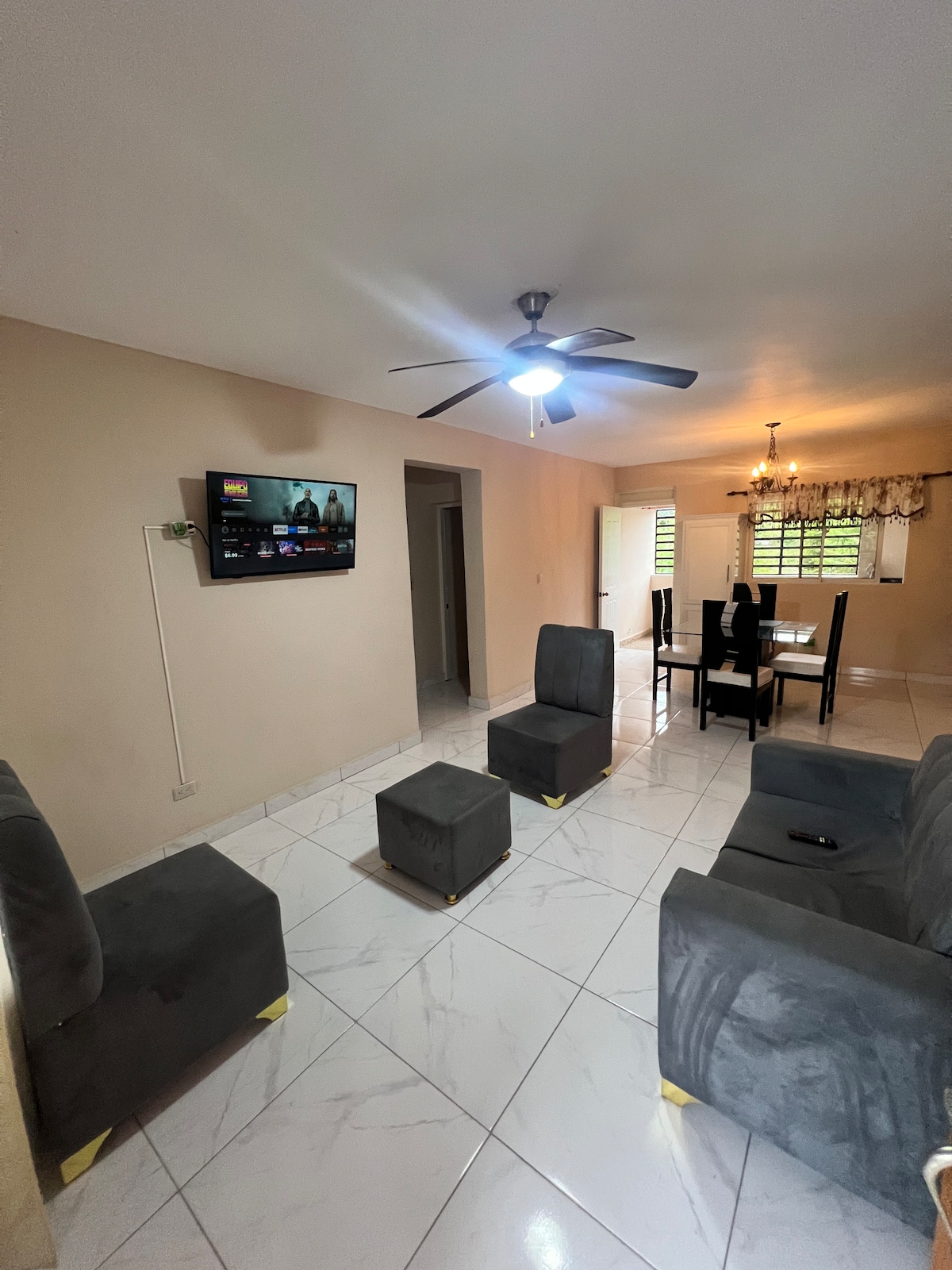 Céntrico y cómodo Apto. de 1 Hab. con Aire Acond., 2 Ventiladores de techo, cama King con tecnología Doble Pillow Top y 4 almohadas, WIFI banda ancha, TVs de 58" y 43" con Netflix, HBO Max & Disney Plus Gratis. Sofa cama y cuna opcional. Sala con cómodo mueble, ducha caliente y drenajes tecnología Anti-Insectos. Nevera ejecutiva con congelador, estufa de gas y extractor, microondas, cafetera, meseta y gabinetes. Moderna Caja fuerte, 2 detectores de humo y CO2 y extintor contra incendios.