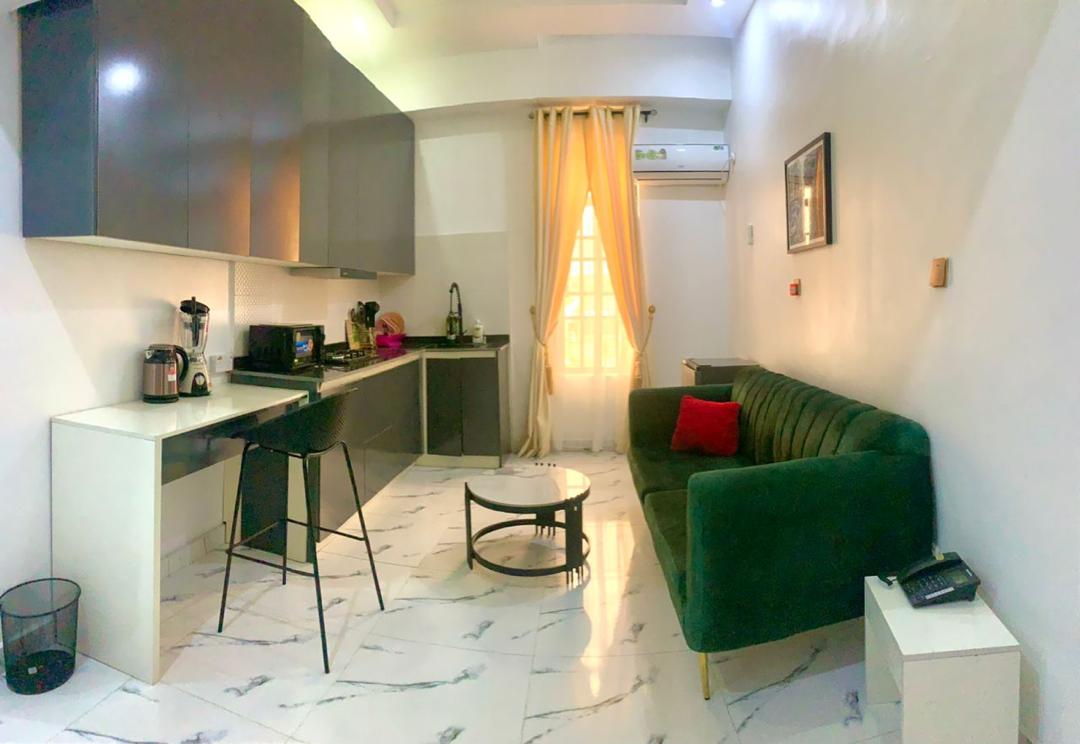 Este acogedor apartamento cuenta con un dormitorio con armario elegante y ventiladores. Sala de estar con ventiladores de aire acondicionado de televisión y lugar de trabajo. Cocina moderna equipada con cocina de gas, nevera, congelador, tostadora, utensilios de cocina y microondas. Baño con ducha situado en una comunidad cerrada y construido en un espacioso complejo cerrado con estacionamiento gratuito y reconocido suministro de seguridad para tres cámaras exteriores soportadas con luz de inundación. Fresco de energía solar las 24 horas con generador de 40 KVA.