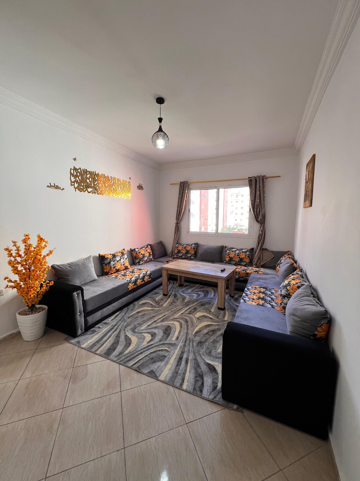 Excellent, bright apartment in Agadir, host city of the 2025 Africa Cup of Nations, just a 2-minute walk from the bustling Souk Elhad bazaar, offering all the comforts needed for a pleasant stay. It includes: 2 bedrooms: one with a double bed and the other with two twin beds, a living room with IPTV and Wi-Fi, a dining room, a fully equipped kitchen, a bathroom with toilet, and a spacious terrace perfect for relaxing. The location is close to all amenities and the city center. 2km from the beach