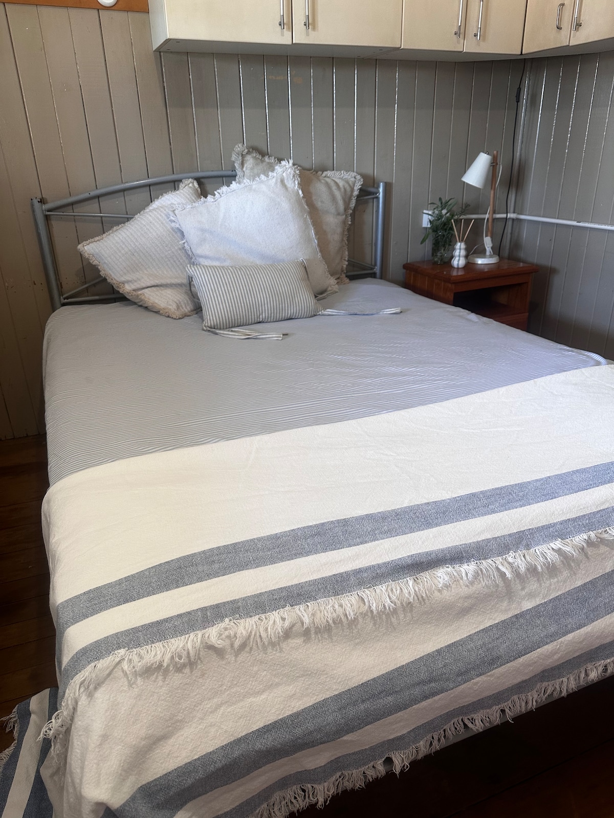 Escape to our trendy studio retreat! Perfect for solo travellers or couples, it features a cozy queen bed & air conditioning. Your stylish bathroom is just a few steps across the courtyard in the adjacent building. Enjoy convenient amenities like a washing machine, mini-fridge, microwave/toaster/kettle. Relax in our garden paradise under the covered courtyard or pergola. Plus, there's shaded parking. We're conveniently located minutes from the CBD, highways + shopping. We can't wait to host you!