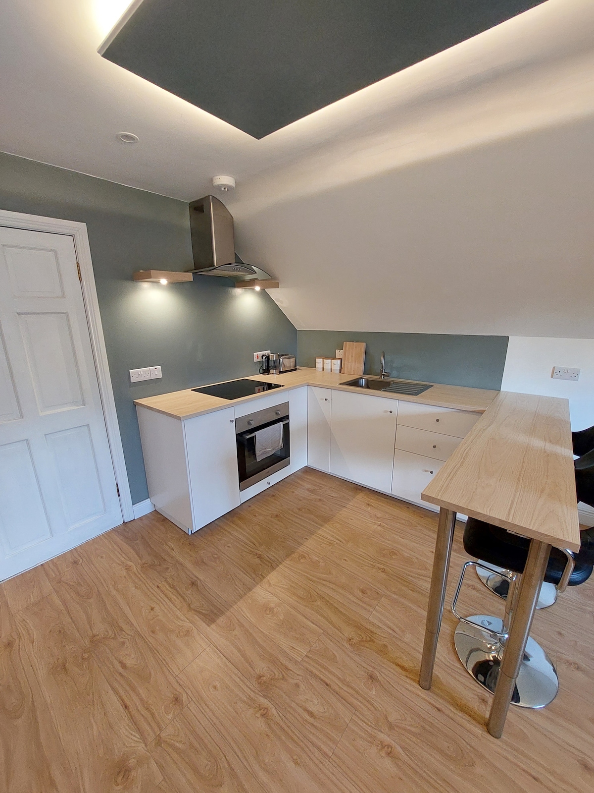 Apartamento loft luminoso, espacioso, alegre y bien decorado, un dormitorio con cama tamaño king y sofá que se convierte en una cama individual (3' 6" de ancho) o doble (4'8") en la sala de estar. Hay una ducha en suite con w.h.b y WC. Una cocina moderna totalmente equipada con nevera, lavadora, placa eléctrica, horno microondas, hervidor de agua y tostadora. Televisor Sky Q de pantalla plana de 46 pulgadas (todos los canales) junto con wifi gratuito. Tenemos 3 alojamientos separados (con capacidad para 9 a 10 personas, no se admiten despedidas de soltero/a).
