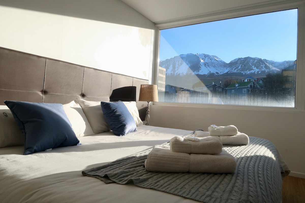 The best view of the world's end. Great view from bed room and Iiving room. New apartment, fully furnished in a perfect location. Just 300 meters from San Martín (main street). Early check in at 8 am included. Late check out at 4 pm included. Radiant slab. Electrical stove. Microwave. Washer dryer. Wifi Internet included. Two smart tv. Towels included. Toilet paper and soap included just for the first day.