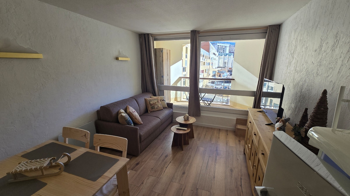 Studio tout équipé situé au 1er étage, parking gratuit au pied de la résidence. Vous trouverez une banquette lit en 160*190 cm et également un lit superposé en 70*190cm. La cuisine est équipée avec lave linge, sèche linge, lave vaisselle, plaque induction, micro-onde et réfrigérateur. Nombreux rangements. La salle de bain est entièrement rénovée avec baignoire et sèche serviette. Toilette séparé. La loggia vous permet de profiter de l'extérieur avec vue sur les montagnes.