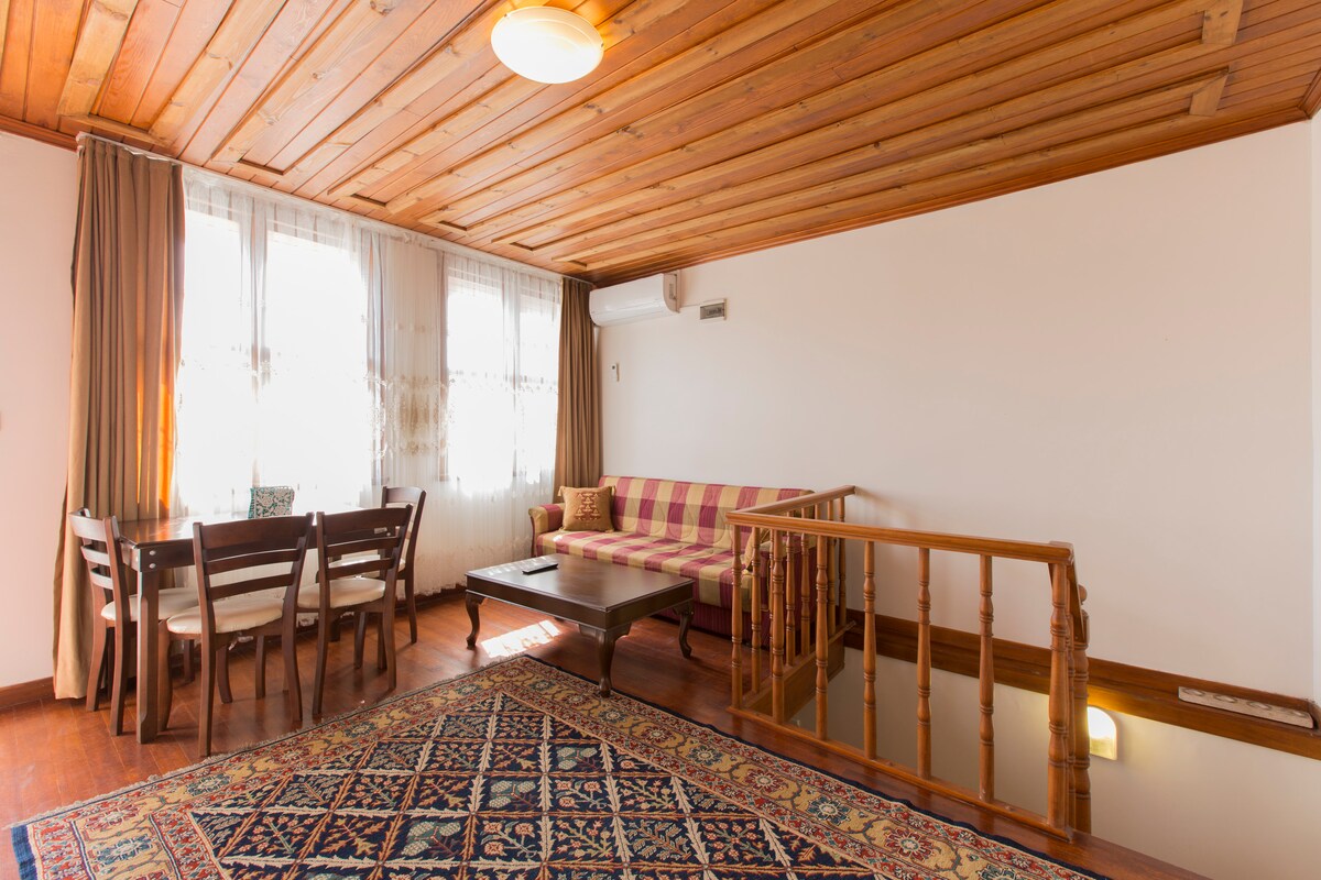 Esta elegante, bien decorada (todos los muebles de madera están hechos a mano), impecablemente limpia, grande y única suite tiene un baño de alta calidad y ascensor en la excelente ubicación en el distrito de Beyoğlu/Taksim. Además, desde su balcón privado se puede ver la magnífica vista panorámica del Bósforo (hasta las Islas Príncipe y el lado asiático) y la península histórica (palacio de Topkapi, Santa Sofía, mezquita de Süleymaniye, torre de Gálata, junto con otros monumentos famososos).