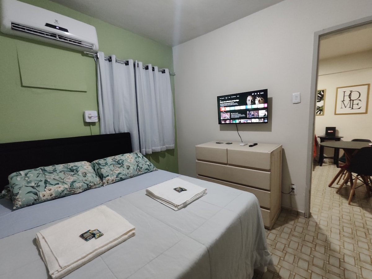 Espacio bien equipado con suite. Tiene aire acondicionado, TV inteligente, minibar, cama doble y escritorio. Cocina exterior compartida, equipada con estufa, refrigerador, mesa, cafetera, sandwichera, microondas, entre otros. Hay una parrilla con zona abierta para el ocio. La cocina está bien equipada con lo necesario para preparar tus comidas. El entorno es tranquilo, familiar y muy bien ubicado. Cerca del aeropuerto de Guararapes, el centro de la ciudad, la ciudad universitaria, Boa Viagem, Olinda...