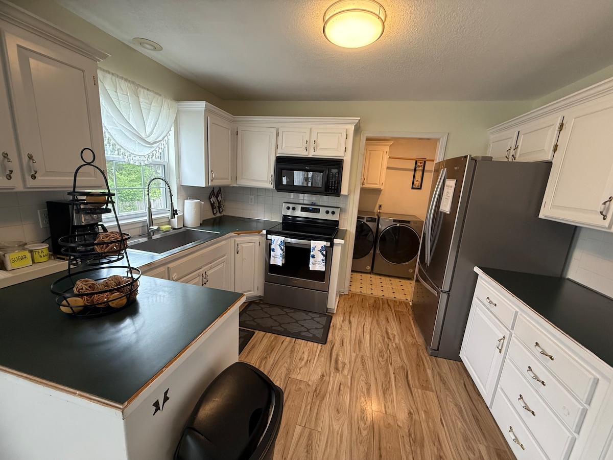 Cheerful 2-bedroom cottage four miles from stadiums with free parking on premises. Family friendly with country feeling close to the city. Bathroom has a walk in shower. Large fully stocked kitchen with separate dinning area. Refrigerator with ice and water through the door. The kitchen has a dishwasher and a washer and dryer laundry area. Plus an added bonus a fully stocked coffee bar. Also added is a EV 240 volt receptacle for charging EV over night.