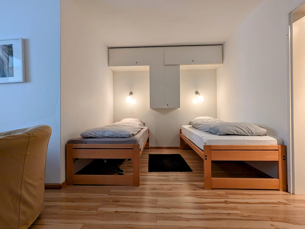 ¡Pequeño pero bonito! Céntrico, pero absolutamente tranquilo. El estudio es nuevo y está amueblado. La habitación es luminosa, con una hermosa vista de Brämabüel y Jakobshorn. El cómodo sofá cama se puede abrir y cerrar con un asa, por lo que hay una sala de estar cómoda y acogedora disponible. Cafetera y hervidor de agua están disponibles junto a la cocina con horno. Microondas y congelador en una habitación separada. El jardín se puede compartir.