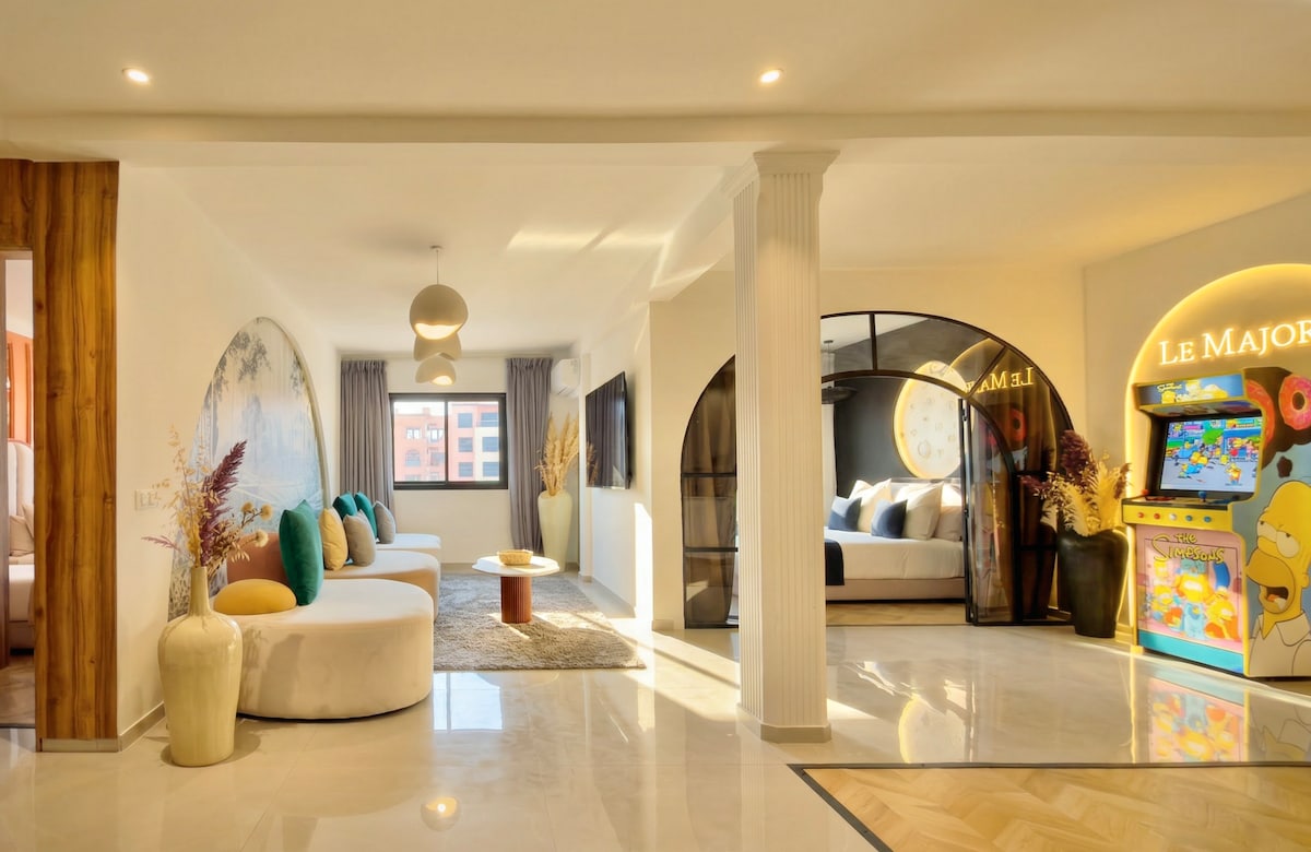 Apartamento de alta gama de 130 m² con vistas abiertas a los jardines de Majorelle. Situado en el 5º piso, sin vecinos, ofrece un salón de 60 m² abierto a la terraza, un jacuzzi de 4 plazas, una cocina Bosch altamente equipada, fibra óptica de 100 Mb, TV Sony de 75" 4K y sonido Bose. A 10 minutos a pie del centro de Guéliz, a 15 minutos del Hivernage. Lujo, tranquilidad y confort.
