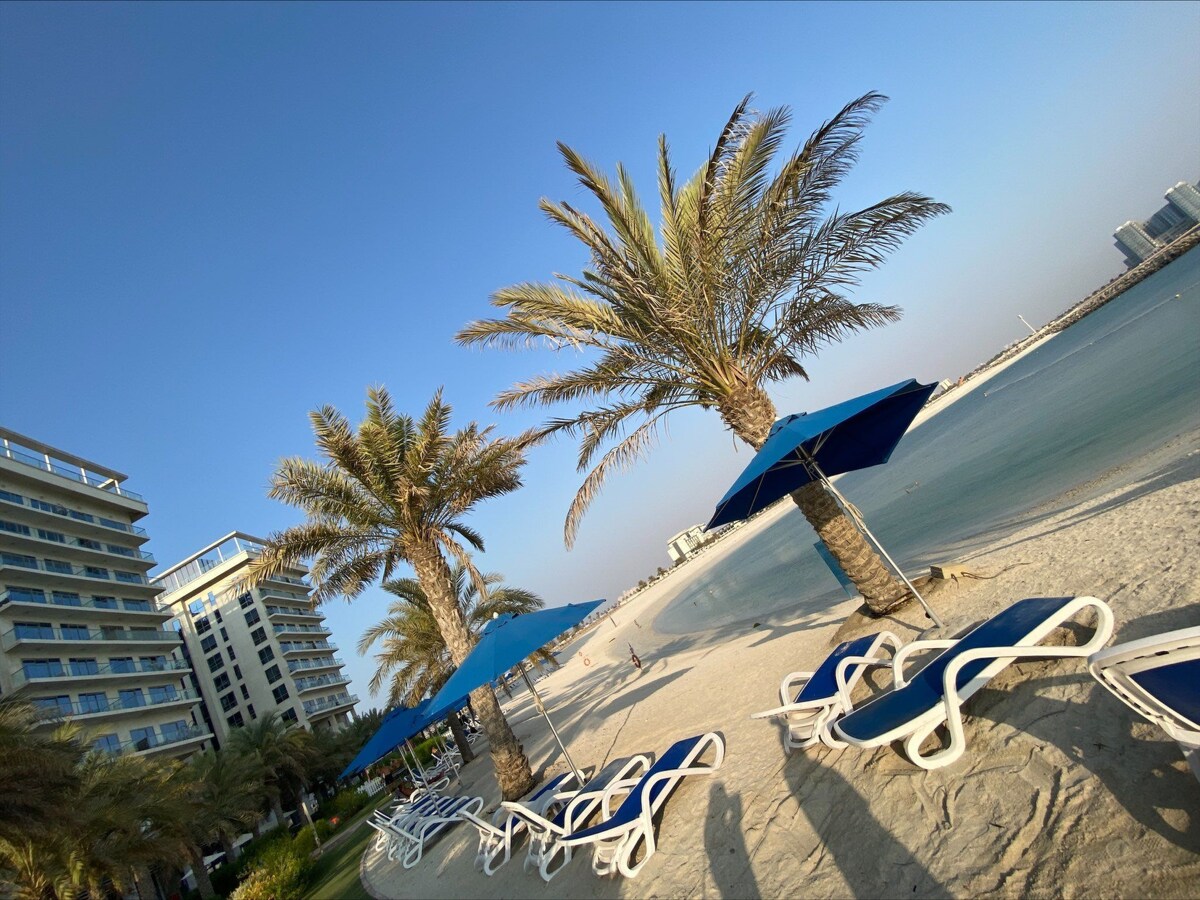 Suite de un dormitorio totalmente renovada a pocos pasos de la playa gratuita, campo de golf, puerto deportivo y cerca de los hoteles de lujo Ritz Carlton, Waldorf y Hilton. A 20 minutos en coche de las montañas Hajar. Conserje/caja de seguridad las 24 horas. Aparcamiento gratuito. Gratis: gimnasio, piscina, piscina infantil y 2 áreas de juego infantiles. Preciosa terraza grande con asientos y vistas completas al mar. Para dormir: 1 cama tamaño king + 2 sofás cama. Cocina: cocina, lavadora, nevera, Nespresso, tostadora. Otros: wifi, TV inteligente de 55 pulgadas, Netflix, toallas de playa, sombrilla.
