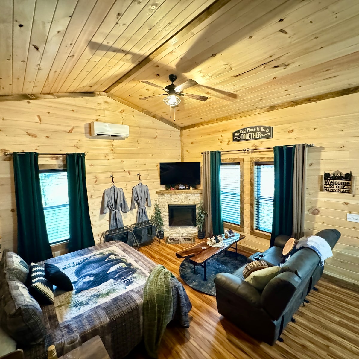 Solo para parejas. Relájate en este espacio tranquilo y elegante. Construido en 2023, con comodidades de primera línea. Cabaña independiente con acceso al lago, trae tus cañas de pescar. No se permiten REMOLQUES DE BARCO o COCHE. Jacuzzi privado. Chimenea de gas al aire libre y TV al aire libre. Cómodos asientos al aire libre y una parrilla de propano BLACKSTONE. Juego de agujeros de maíz para mantenerte entretenido. El inodoro del baño tiene asiento con calefacción, bidé. Espejo con sensor de movimiento con Bluetooth. Cama tamaño queen Sleep Number. NO SE PERMITEN NIÑOS, NIÑOS PEQUEÑOS, BEBÉS ni MASCOTAS