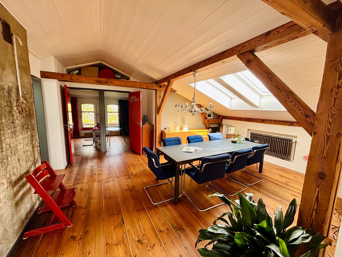 Les espera una sorpresa especial: ¡una habitación tipo loft maravillosamente espaciosa en el ático! Una habitación con mucha, mucha luz y aún más espacio. En el centro se encuentra la espectacular ventana redonda orientada al sur, que proporciona el marco para la vista de postal del prado del castillo. Al oeste se encuentra la espaciosa terraza. Es la sala de desayunos perfecta y, por la noche, el lugar ideal para ver la puesta de sol.