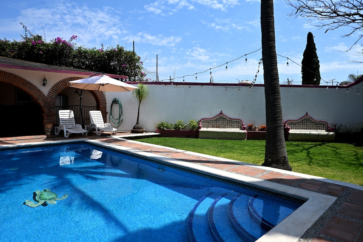 Increíble casa en una de las mejores zonas de Cuernavaca. En esta casa se respira la tranquilidad. No hay ningún ruido del exterior, más que los de la naturaleza. Cuenta con un hermoso jardín y una amplia área de piscina con camastros. La casa está completamente equipada con aire acondicionado, wifi, televisión, netflix, etc. Es el lugar ideal para relajarte!! Dentro de la propiedad hay otra casa, sin embargo son completamente independientes y se respeta la privacidad de cada una.