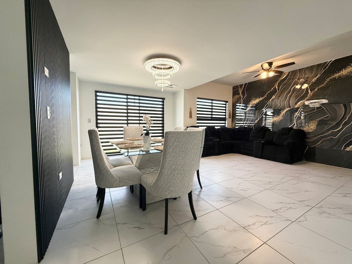 Welcome to Casa de Romina a luxury and spacious stay in Ciudad Juarez, this house is located in a gated community with automated access, and it's only 5 minutes away from the US Consulate ( 4 Km) This property is a 3 BR house, 2.5 bathrooms. Bedrooms have 1 King bed, and 3 Queen size beds. We have a full kitchen which you're to use during your stay. Laundry room has both washer and dryer ready to be used. Price listed is for 4 people, each additional guest pays 10 USD per night (Maximum 8).