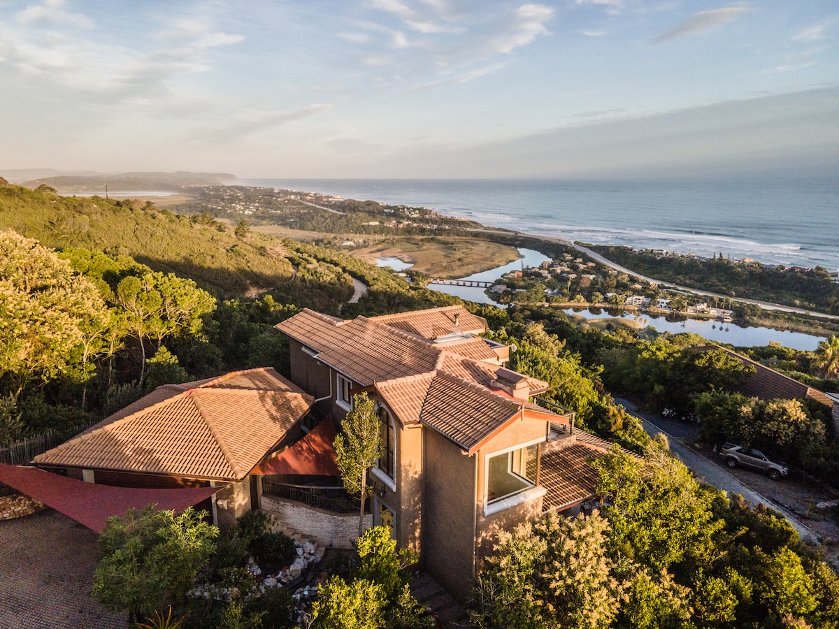 Ubicada en lo alto del lago Swartvlei, en dunas antiguas, Cloud 9 Villa ofrece vistas de 360º de las montañas Outeniquas, vlei y mar. Esta obra maestra arquitectónica cuenta con 8 dormitorios, con capacidad para 16-18 personas, inspirada en la geometría sagrada. Alojamiento independiente. Ideal para retiros familiares, bodas o sesiones de estrategia. ¡Alimentada con energía solar! 🌞 Ponte en contacto con nosotros para obtener más información. 🏡✨