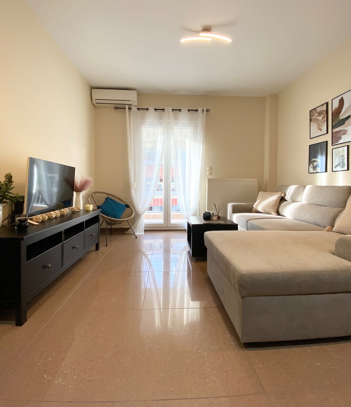 El apartamento está situado en el corazón de Kalamaria, una animada zona urbana de Tesalónica. Este apartamento ofrece una estética moderna y funcionalidad. Las habitaciones, luminosas y bien ventiladas, crean un ambiente acogedor, mientras que el mobiliario combina líneas modernas con comodidad. El amplio salón y la cocina totalmente equipada lo hacen adecuado para estancias largas.