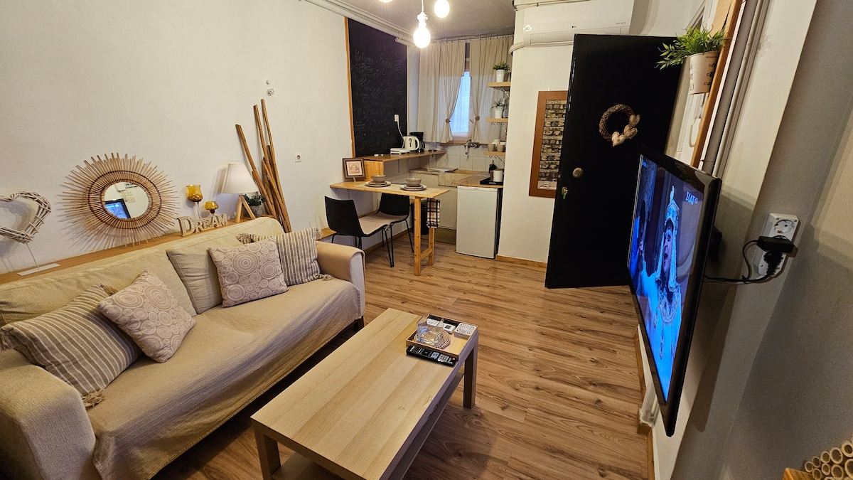 Estudio de primera planta recién reformado en el corazón de Kalamata, en las inmediaciones de la plaza central y el Centro Internacional de Danza. Cuenta con 1 cama tamaño king y una cocina totalmente equipada. Moderno, bien amueblado y totalmente funcional. Es adecuado para parejas, familias con bebés, profesionales o cualquier otra persona que desee relajación y tranquilidad.