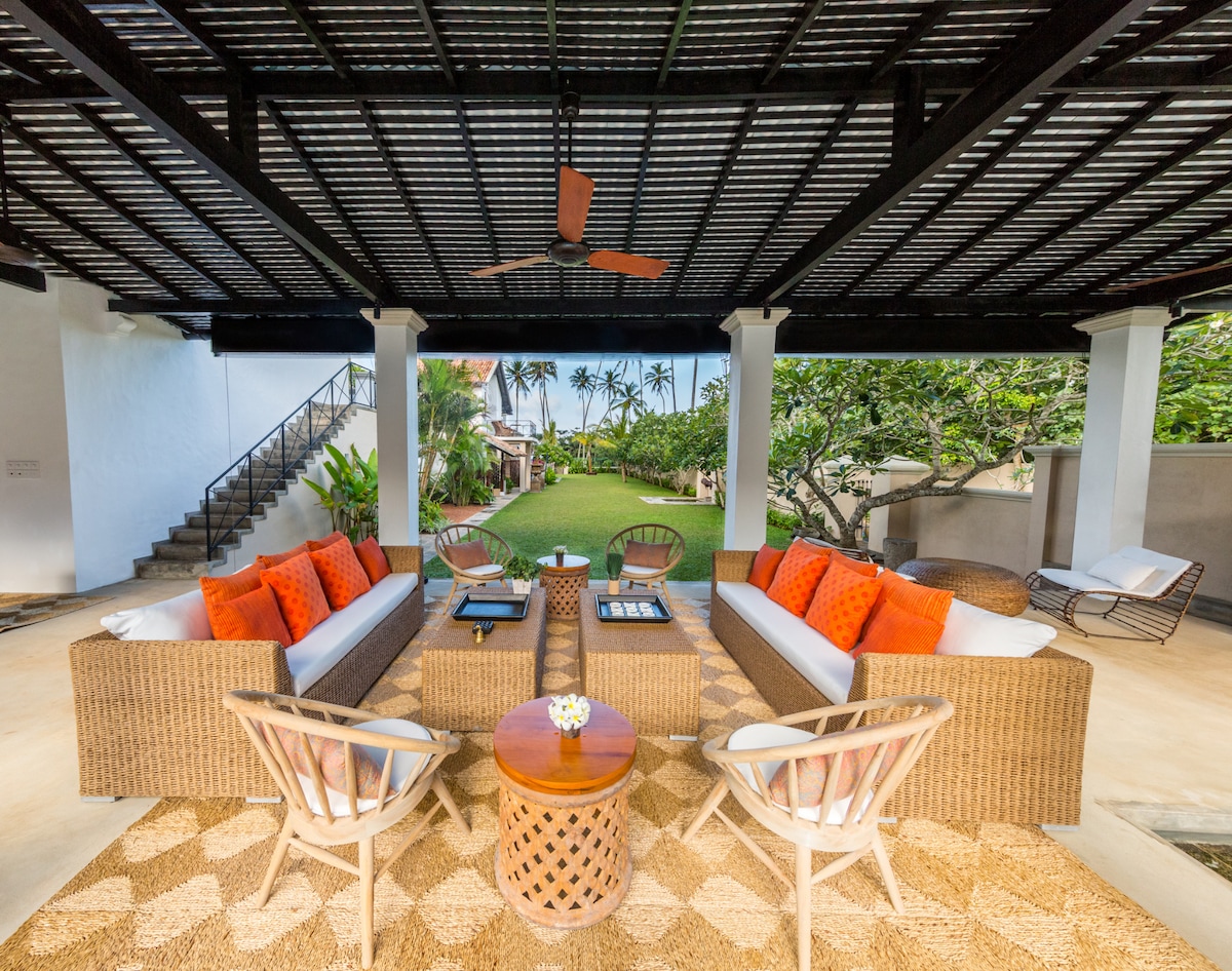 Spacious California king room with private bathroom and bathtub, AC, Smart TV, free Wi-Fi, mini fridge, and full luxury amenities including slippers, towels, shampoo, lotion, dental and shaving kits, loofah, and more. Guests can relax on the verandah or in the living area, enjoy Ayurveda spa sessions and yoga classes in the attic. Just steps from the beach with optional airport pick-up, Sri Lanka tours, and curated meal services.