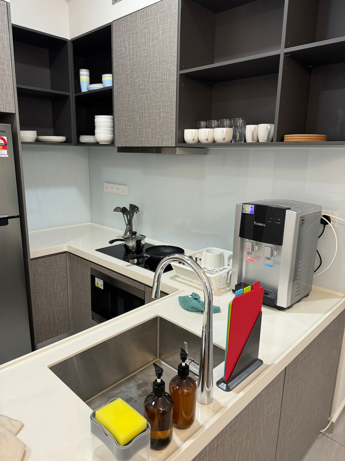 2 dormitorios, 2 baños, apartamento de servicio de lujo. Televisión inteligente ilimitado de 800 mbps (Unifi) de alta velocidad de 43 pulgadas en el dormitorio privado. Televisión inteligente de 55 pulgadas en la sala de estar. Instalaciones de cocina con placa de gas incorporada, nevera, microondas. A pocos pasos del cine , enchufes F&B, Lotus en el centro comercial Paradm. Fácil acceso ,ubicado en el mismo edificio con bar en la azotea del Hotel Le Méridien, la mejor vista de la ciudad). 24 horas de seguridad de 3 niveles con tarjeta de acceso para entrar en el edificio con estacionamiento privado