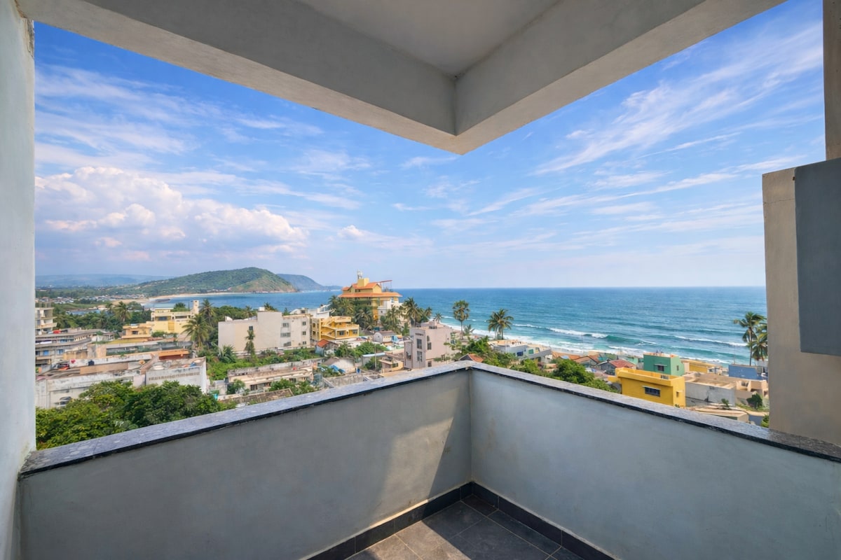 Despiértate con impresionantes vistas de la costa del océano. Esta espaciosa propiedad está situada muy cerca de la playa de Rushikonda (5 minutos en coche) en Vizag. Una estancia verdaderamente digna. Este es un apartamento de 3 dormitorios con aire acondicionado, dormitorios tamaño king, cocina espaciosa equipada, sala de estar premium con lujosa vista a la playa desde el pasillo/patio y dormitorios laterales.