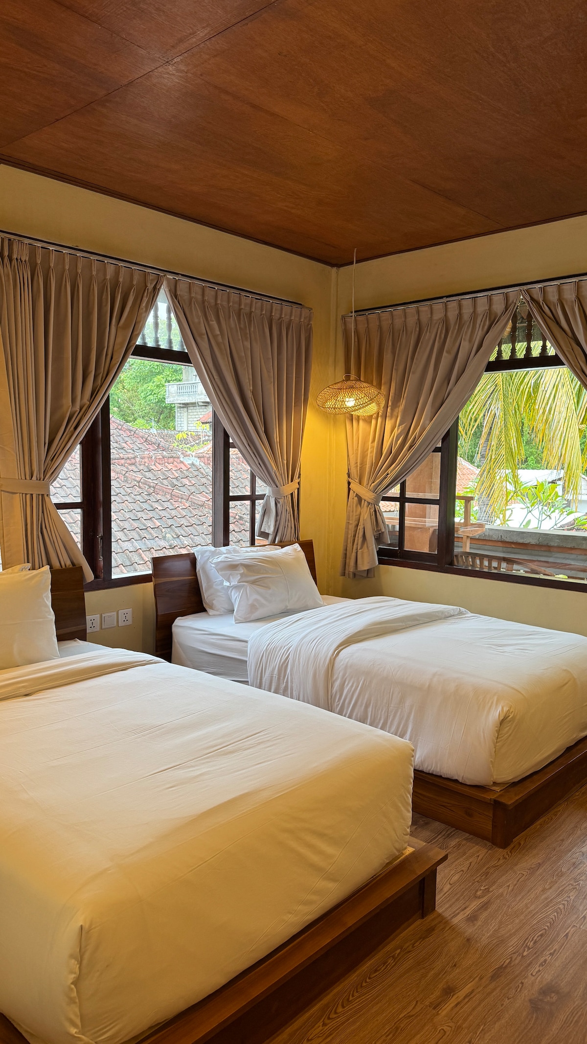 Escápate a una casa de familia tranquila donde la comodidad se encuentra con la naturaleza. Despiértate con vistas a exuberantes jardines tropicales, colinas verdes y serenos campos de arroz, todo a solo 200 metros a pie de la playa. Cada alojamiento está cuidadosamente diseñado para hacerte sentir como en casa, con cocina privada, aire acondicionado, wifi rápido, baño moderno y zona de estacionamiento segura. Ya sea que estés aquí para relajarte o explorar la hermosa costa de Bali, este es el lugar perfecto para relajarte y recargar energías.