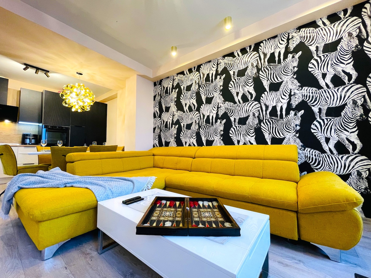 Модерен дизайнерски апартамент разположен в центалната част на гр. Стара Загора. С площ от 120 кв. м апартаментът разполага с голяма трапезария 2 спални 2 санитарни възела и една баня. . Намира се само на 500 м от центъра на Стара Загора и на 100 м от парк Аязмото. В близост ще откриете ресторанти, кафенета, магазини и културни забележителности. На гостите им се предлага осигурено безплатно паркомясто на 200 м.Апартаментът има голяма тераса на която можете да се отдадете на почивка с чаша кафе.