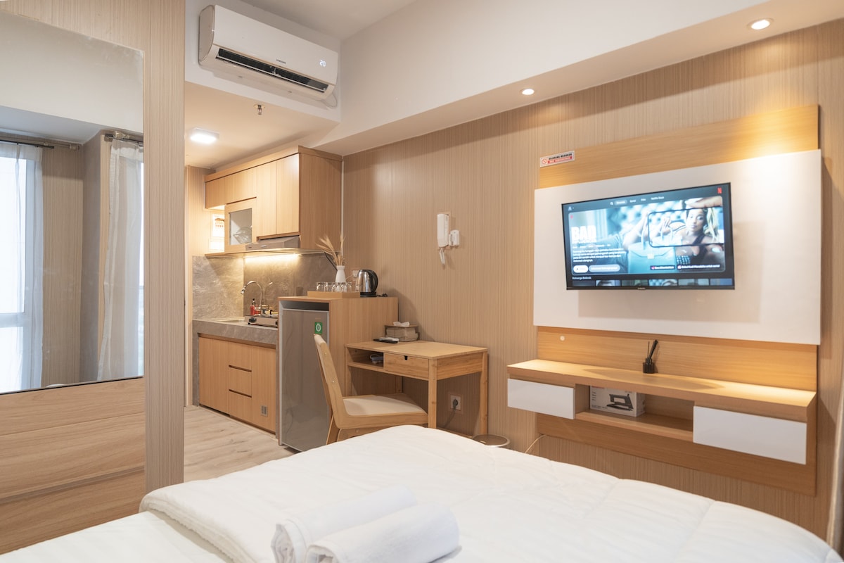 📍Apartment Tokyo PIK 2 We accept longer stay (monthly/yearly) at a special rate, inquiry with us! Only need 1 min walk away, you can reach an outdoor mall, supermarket, over 90 restaurants and shops under the apartment. Our location is also close to Angke Restaurant, Aloha Pantai Pasir Putih, Superhiro Japanese Superstore, Orange Groves PIK, Pantjoran PIK, By The Sea, PIK 1. 🚫Pets aren’t allowed in this building. -Studio Room -Netflix with 32 inch TV -Working table -High Speed Inet