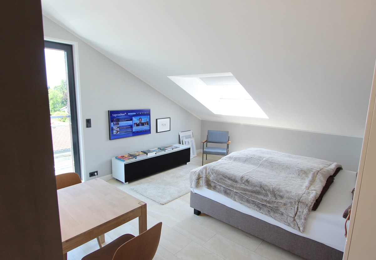 Un encantador estudio en la azotea recién reformado y equipado con aire acondicionado. Situado en el centro de Constanza, cerca de «Seerhein», se puede llegar fácilmente al estudio en la azotea por todos los medios de transporte. Hay cafeterías, tiendas y una panadería cerca. El estudio está perfectamente diseñado para todas las personas que quieran sentirse a gusto en el centro de la ciudad. El baño es pequeño pero está dispuesto de forma práctica. Hay una pequeña cocina con nevera, fogones y lavavajillas.