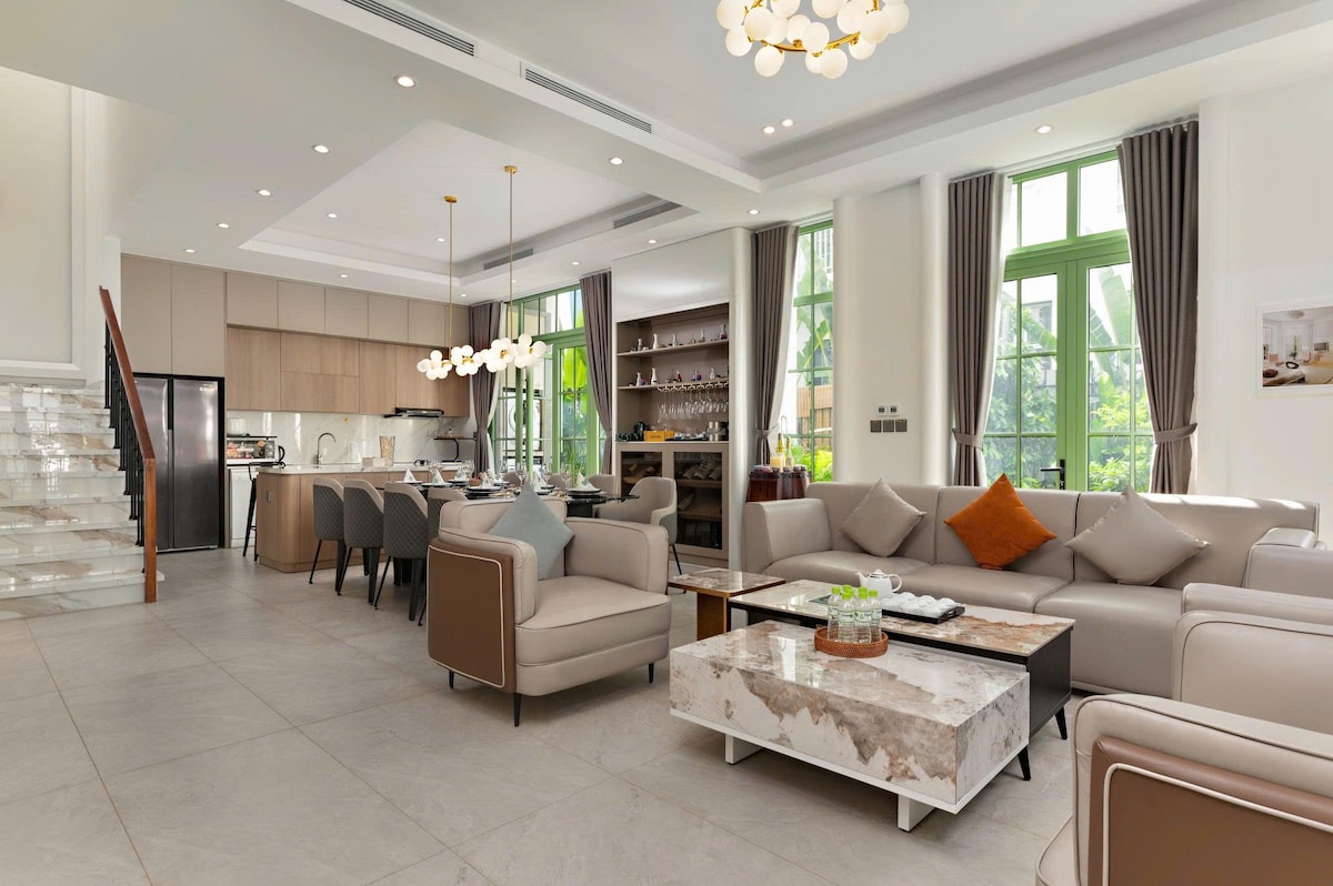 La villa está ubicada en el lujoso centro vacacional Bãi Khem🏖️, con 4 amplios dormitorios y comodidades modernas en el estilo minimalista moderno. El diseño minimalista y refinado utiliza materiales naturales como madera y piedra, creando un ambiente tranquilo. A solo 500 metros de la playa, ofrece fácil acceso a la playa de arena blanca y aguas cristalinas🌊, combinando comodidades modernas con un estilo de vida tranquilo.