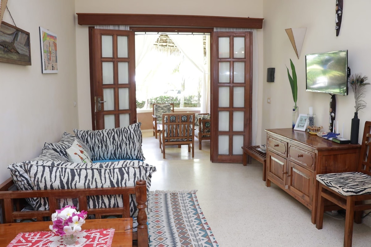 Relájate en este espacio tranquilo y elegante. Un apartamento de estilo villa de 1 dormitorio amueblado con buen gusto situado dentro del mismo complejo con un centro vacacional de playa de 5 estrellas y spa. Disfruta de la serenidad de este lugar rodeado de un césped bien cuidado, un exuberante jardín, servicios del centro vacacional y una playa tranquila sin gente de venta de playa. Situado a solo 10 minutos del aeropuerto internacional de Malindi y muy cerca de restaurantes, lugares de entretenimiento y del centro comercial.