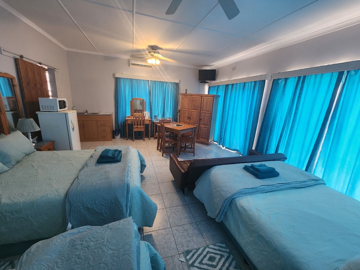 100 Lawson, tu hogar lejos de casa. Estamos justo al lado del Hospital Lenmed, a pocos pasos de los restaurantes y del centro comercial NC. Estacionamiento seguro, piscina de chapoteo, wifi gratuito sin tapa, braai interior y dstv en nuestra lapa/bar con aire acondicionado. Cocina compartida totalmente equipada: cocina tus propias comidas y disfruta de nuestro comedor. Tanque Jo-jo y solar: tenemos agua y electricidad, incluso durante los cierres municipales. Se admiten mascotas. La unidad 1 o 2 solo estará disponible si toda la casa no está reservada.