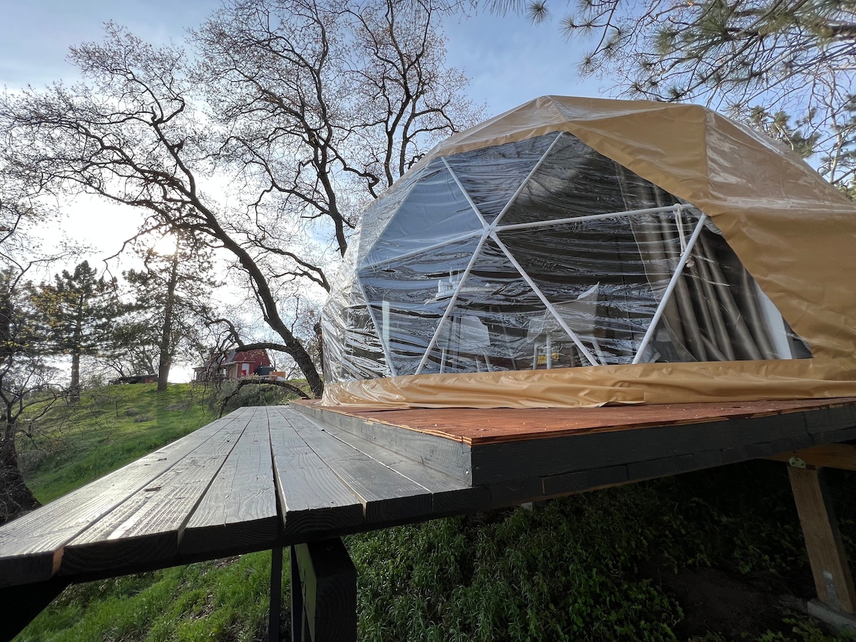 Glamp in style just 15 mins from Kings Canyon & Sequoia! Our cozy geodesic domes sit on 40 acres and include AC, WiFi, a smart TV, and a huge window with a beautiful view. Enjoy a private outdoor deck, access to a modern private bathroom (100 ft away), and a community outdoor kitchen with a grill. Dome offers sweeping views of the valley and mountains. Peaceful, unique, and perfect for couples or solo adventurers.